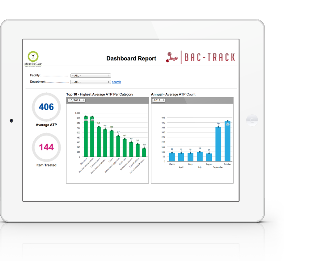 Complete Infection Control PlatformThis dashboard allows you to sort data and measure information around a specific facility, department or equipment category. The Bac-Track history feature also allows you to look at the device’s history and monitor specific assets including the CDC’s recommendations for testing. |